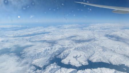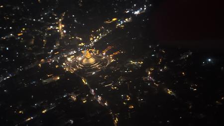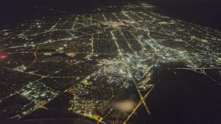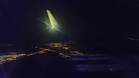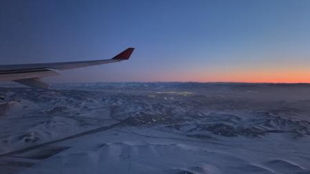 Waking up after an 8 hour flight to this view, it took me a moment to realize that the hazy white ground below was the snow-covered desert. The cluster of lights is the city of Ulaanbataar