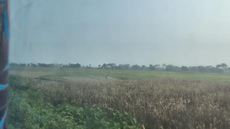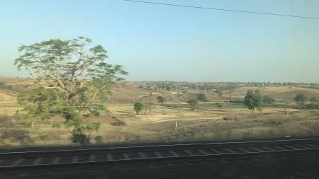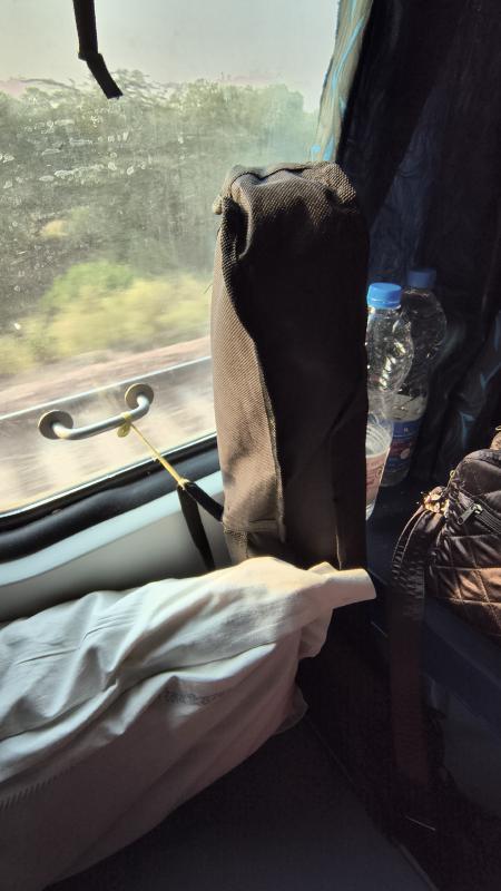 This picture is not about the view outside, instead it is about the long black bag which contains my guitar. This journey was the start of our move back from Ahmedabad to Nepal, and I transported my guitar during this trip. I needed a stable place to keep it during the train, so we designed this setup: the guitar, in its bag, placed between our berth and the table, attached to the window handle to prevent it from falling over.